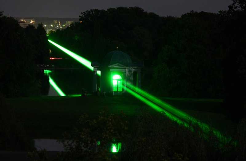 //Der Laser strahlt von der Orangerie durch den Pavillon