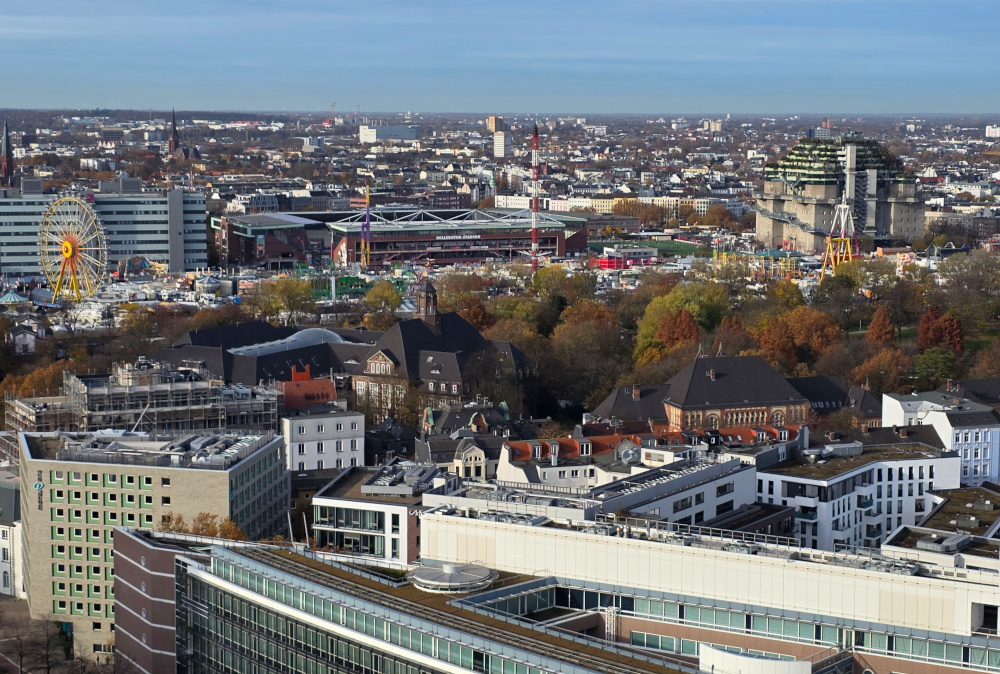 Blick auf St. Pauli mit Millerntorstadion, Bunker und DOM