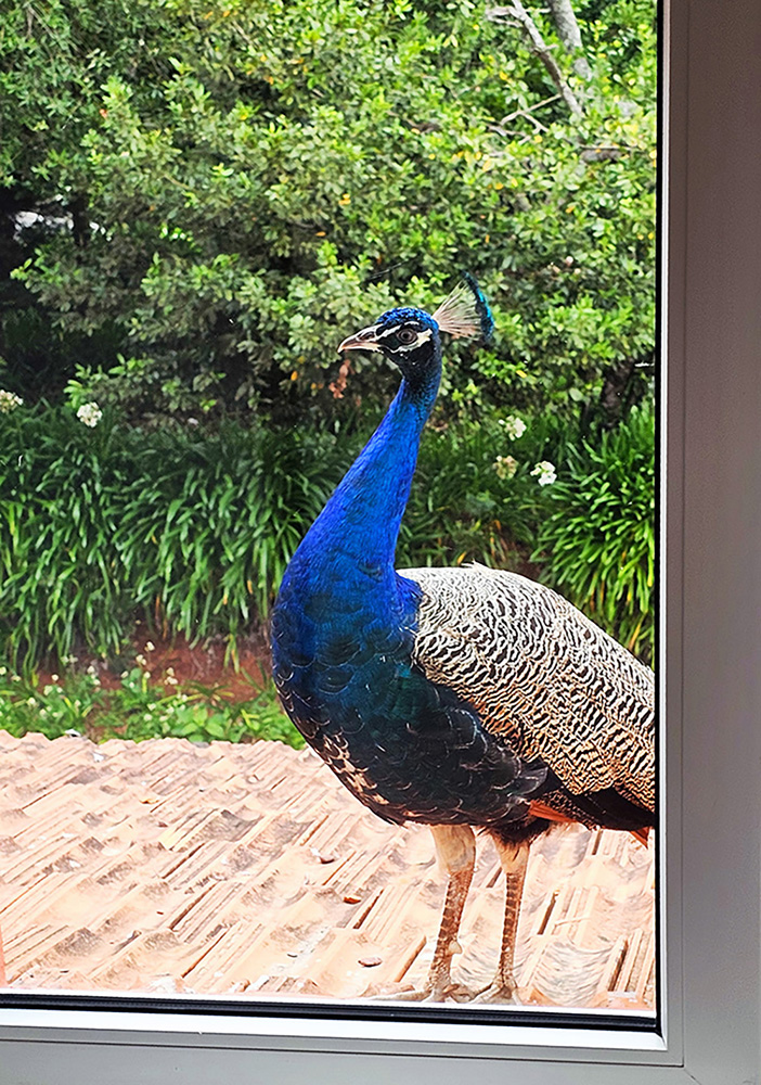 Ein Pfau steht einfach vor meinem Hotelfenster